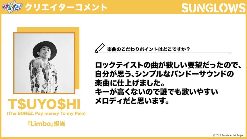 T$UYO$HI(The BONEZ, Pay money To my Pain)「Sunglows『Limbo』」担当